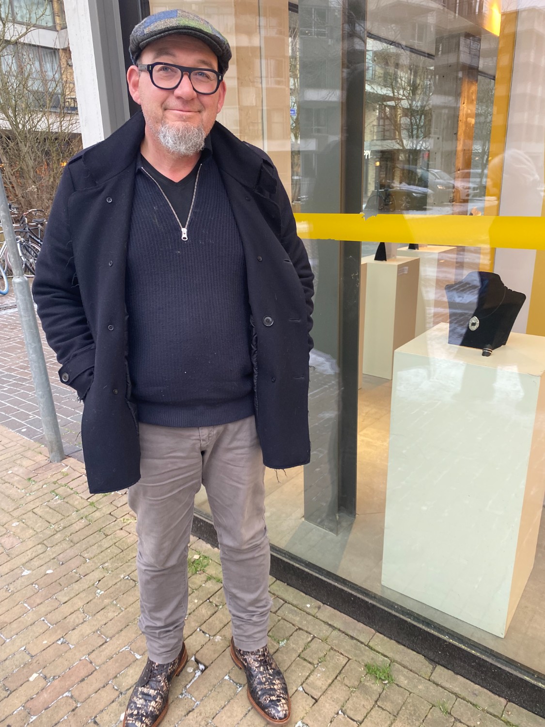 In de etalage aan de kant van de Happy Italy is werk te zien van Jola de Vaan. Zij maakt vilten kleding, met name voor vrouwen. Dit doet ze al vijftien jaar. 'Felle donkere kleuren en asymmetrische vormen zijn voor mij leidend', vertelt ze. Daarbij is de natuur voor haar een belangrijke inspiratiebron. De kleding is niet direct gemaakt voor de verkoop. Maar als mensen interesse hebben, kunnen ze mailen.