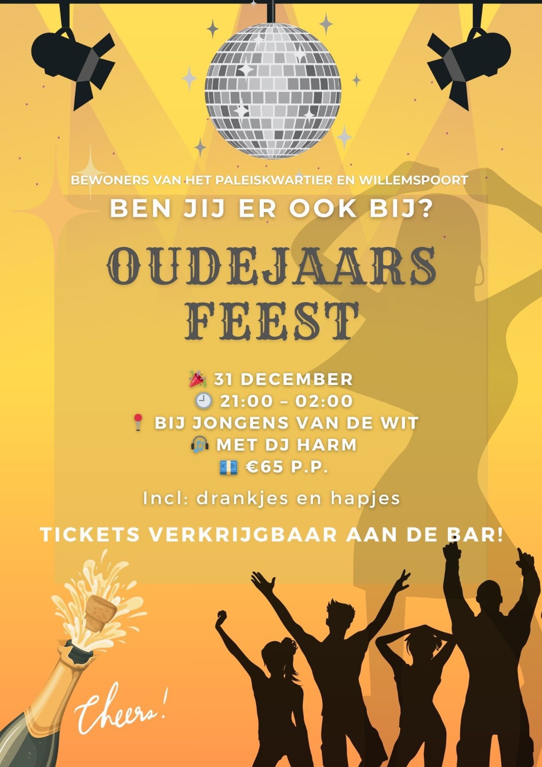 Het feest start 31 december om 21:00 uur. Dan kan er gedanst worden op de speciale dansvloer en zorgt DJ Harm voor goede muziek. Voor 65 euro kan er onbeperkt worden gedronken en kan iedereen genieten van lekkere hapjes.